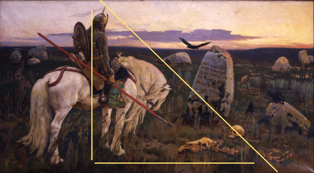 The lines create a triangle in the painting which is a very strong compositional structure that keeps the focus neither on the knight nor on the tombstone but gives equal importance to both. They are linked together in this way. The knight is affected by the message and it has caused him to despair as he is already exhausted. The green boot gives a pop of colour that recalls details from Vasnetsov’s more fantastical paintings, perhaps also giving us a bit of hope that this is a mystical fairy tale hero and his magical help will arrive soon.