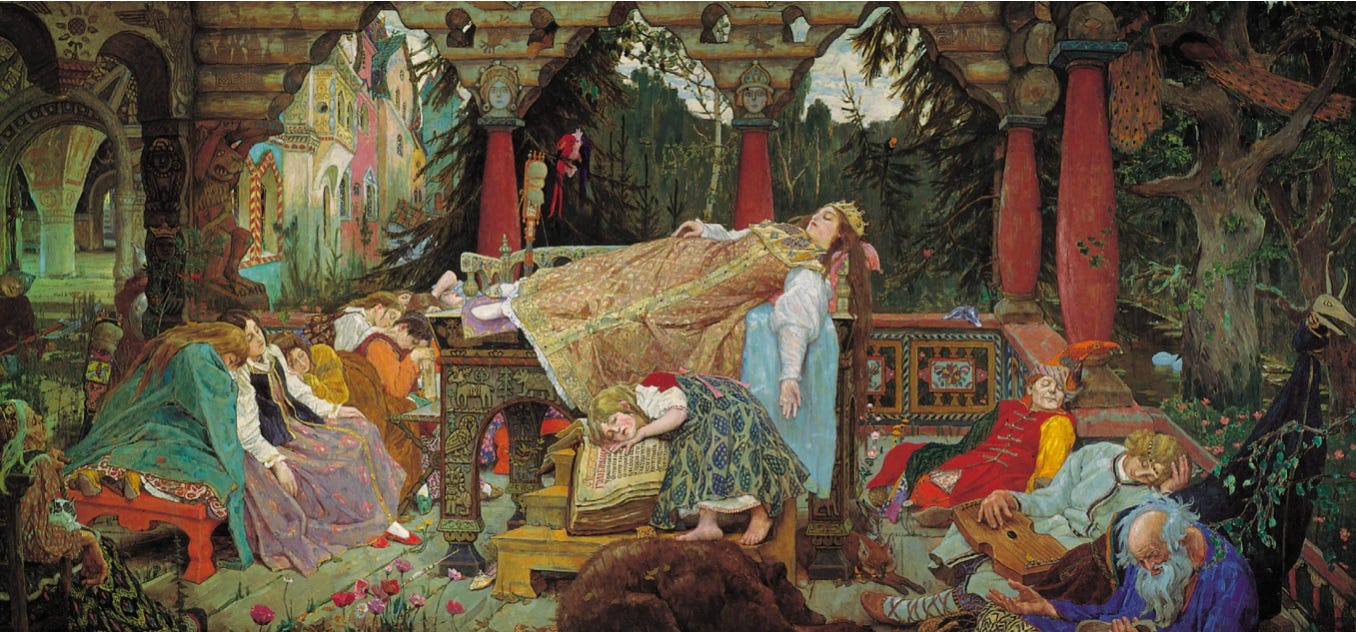 The story of Sleeping Beauty is well known and repeated in many different cultures in different ways. This painting in particular depicts the story as an archive of Russian folk culture. The architecture of the dilapidated castle, the colours of the columns, the clothes of the Princess and her court, the painted tiles on the walls and the furniture are all extremely Russian in their details. By painting this, Vasnetsov is a kind of historian or archaeologist who is keeping a treasure trove of these visual details for future generations to appreciate. The rich colours of this painting certainly make it a treasure itself not only of the cultural history it depicts, but itself as a work of art and a piece of Russian culture. This story itself can be considered an allegory for Russia. Asleep for so long, she can always be revived with true love’s kiss. In a way this is what artist’s do with their art work: by loving something so much, they revive it through its depictions.