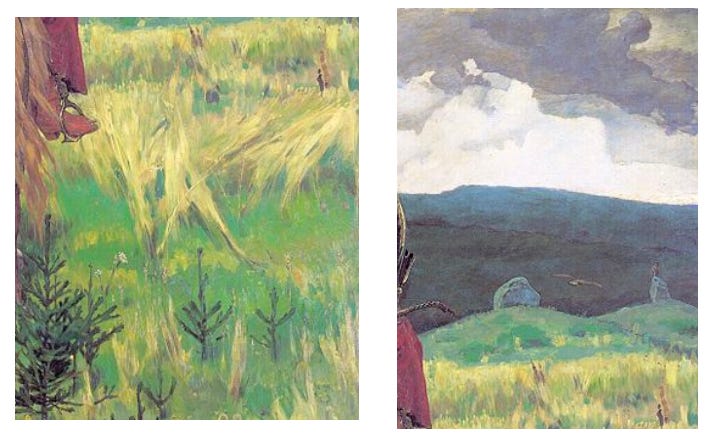 The landscape painting in Vasnetsov’s work is not a pastiche of European landscape as the Imperial academy would use. Vasnetsov paints Russian landscape to house its nationalistic fairy tale characters. Vasnetsov was truly trying to depict his home, rather than try to impress the salon by painting Italy or France from references to older paintings. This is what made his work so fresh and interesting.