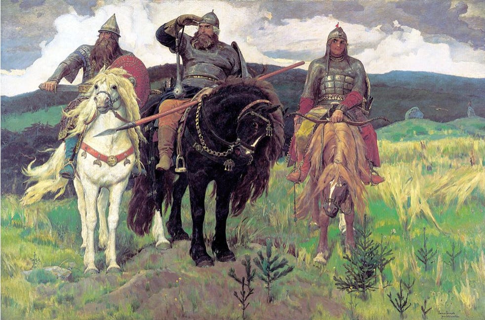 A Bogatyr is a character in slavic legends that is equivalent to a knight-errant in Western romances. Bogatyrs appear in bylinas which means fairy-tales, but literally translates to “something that was”. These stories were usually about a historical event but had fantastical and fairy-tale elements in them. These are different from skazkas stories which means “something that is said”. Skazkas are stories that are completely fantastical. Bogatyrs were mythical Russian heroes equivalent to King Arthur and the Knights of the Round Table. Painting them solidified a mythical ideal of masculinity to which young Russian men could aspire.