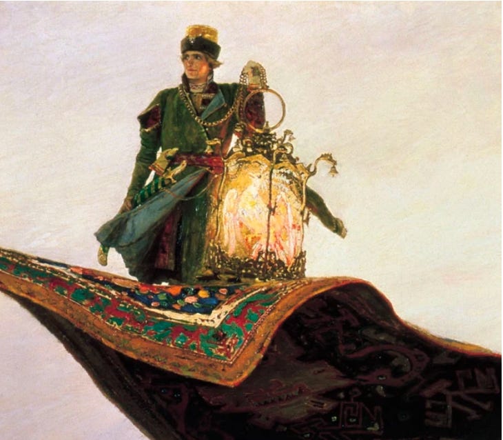 The story depicted in this painting is about Prince Ivan and the Firebird. A young Prince steals a Firebird and rescues a Princess, and in some versions of the story, flies home on a magic carpet. This painting situates the Russian fairy tale in the real life Russian landscape thus bringing the story to life so that if someone were to see this landscape in reality, they could imagine a magic flying carpet might have flown through the sky there.