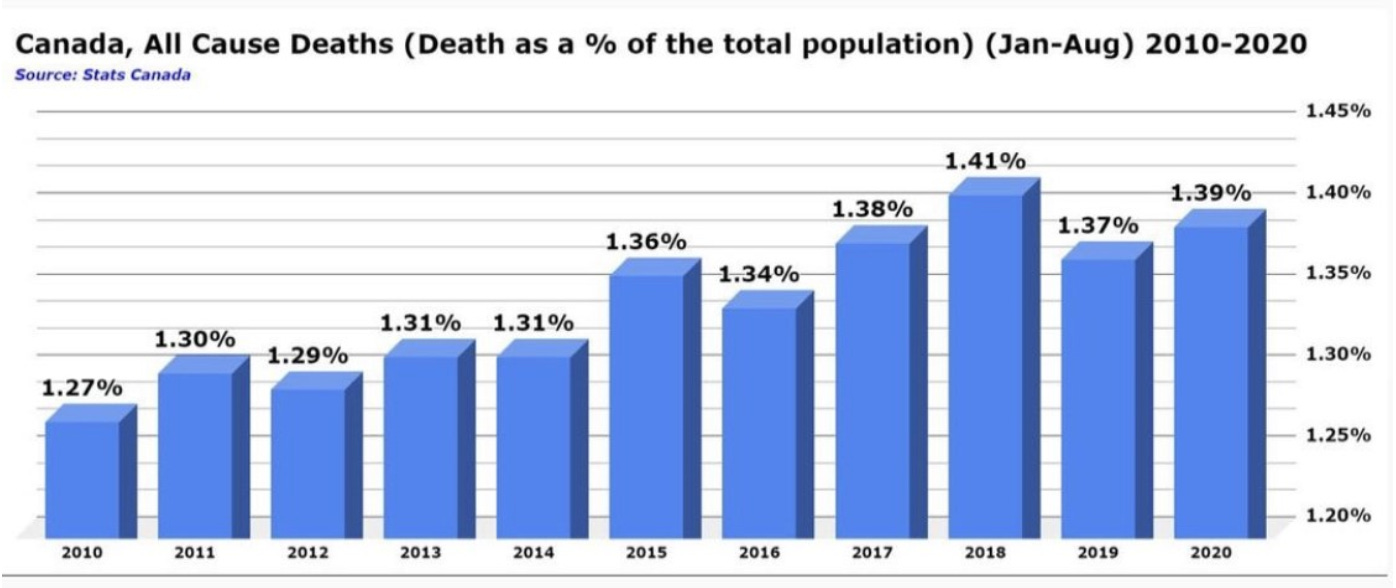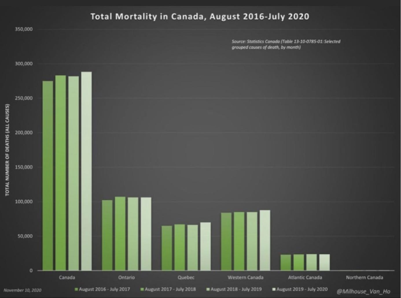 Fig 10. The Covid-19 Pandemic itself may be called into question considering the number of deaths in 2020 compared to other years is largely unremarkable. If there were truly a pandemic, we would be able to see a clear rise in deaths in the year 2020 compared to others. Source: Stats Canada