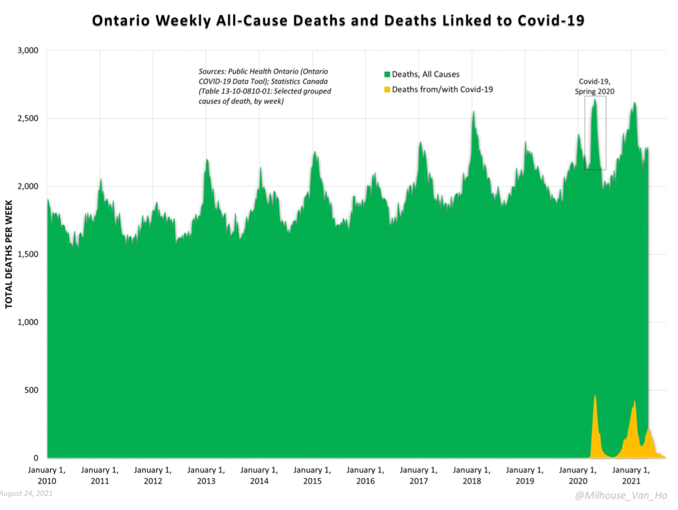 Fig 12. Weekly all cause deaths due to Covid-19 are insignificant compared to normal. The pandemic is not as deadly as the media makes it out to be. Source: https://t.co/sDGQltJapg?amp=1 , https://t.co/Qh0WO84rkl?amp=1