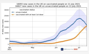 Fig 7. Yet the number of new cases among the vaccinated and the unvaccinated is identical and in fact seems to be increasing among the vaccinated.