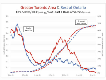 Fig 9. Vaccination rates were the same inside and outside the GTA (greater Toronto Area) in Ontario, Canada. Yet, the death rates due to Covid-19 were greater in the GTA compared to outside. This means that vaccination rates do not affect mortality from Covid-19.