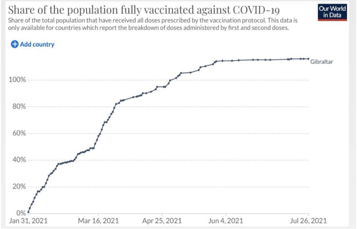 Fig 1. Share of the population (of citizens) in Gibraltar that is fully vaccinated is at 100%. The only unvaccinated people are tourists that make up a very small percentage of the total population.