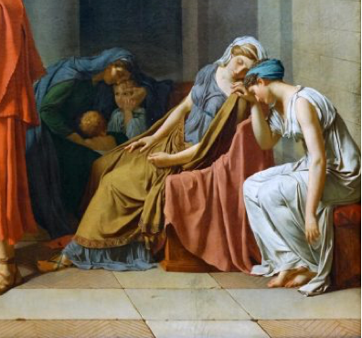 This painting by David depicts a story from the first book of Livy in Roman Antiquities by Dionysius of Halicarnassus. In this story, there are two waring cities: Rome and Alba. Instead of the entire city going to war, each city agrees to choose three men to defend the city in a duel to the death. The city with the victorious fighter would win the war. Rome sends three brothers from the Horatii family, and Alba sends three brothers from the Curiatii family. Unfortunately, the families have already intermarried. A Horatii brother has a Curiatii wife and a Curiatii brother has a Horatii wife. As a result, no matter the outcome of the fight, there will be tragedy for the family. David depicts the juxtaposition of the masculine and the feminine responses to the sacrifices of war in the composition of the characters in his painting.