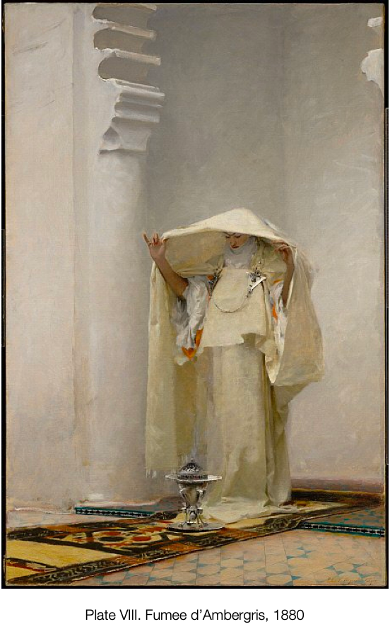 We will conclude our lesson on John Singer Sargent with one last mysterious woman. The painting depicts a woman in an ivory gown, standing over a metal dispenser with smoke rising out of it. Her hands are adorned with rings, bracelets and nail polish and lift up her veil in a tent to catch the smoke and bring it to her face. Her eyes are lined with kohl and her gaze is lowered in intense focus upon her task. She stands on colourful rugs with an eastern pattern and stands in front of what appears to be Moroccan architecture. Everything about this painting is enigmatic, perhaps even more so than Madame X. The woman in this painting is supposedly from Tangiers. It is a painting, foremost, about the mystery and allure of those non-European cultures to European painters.