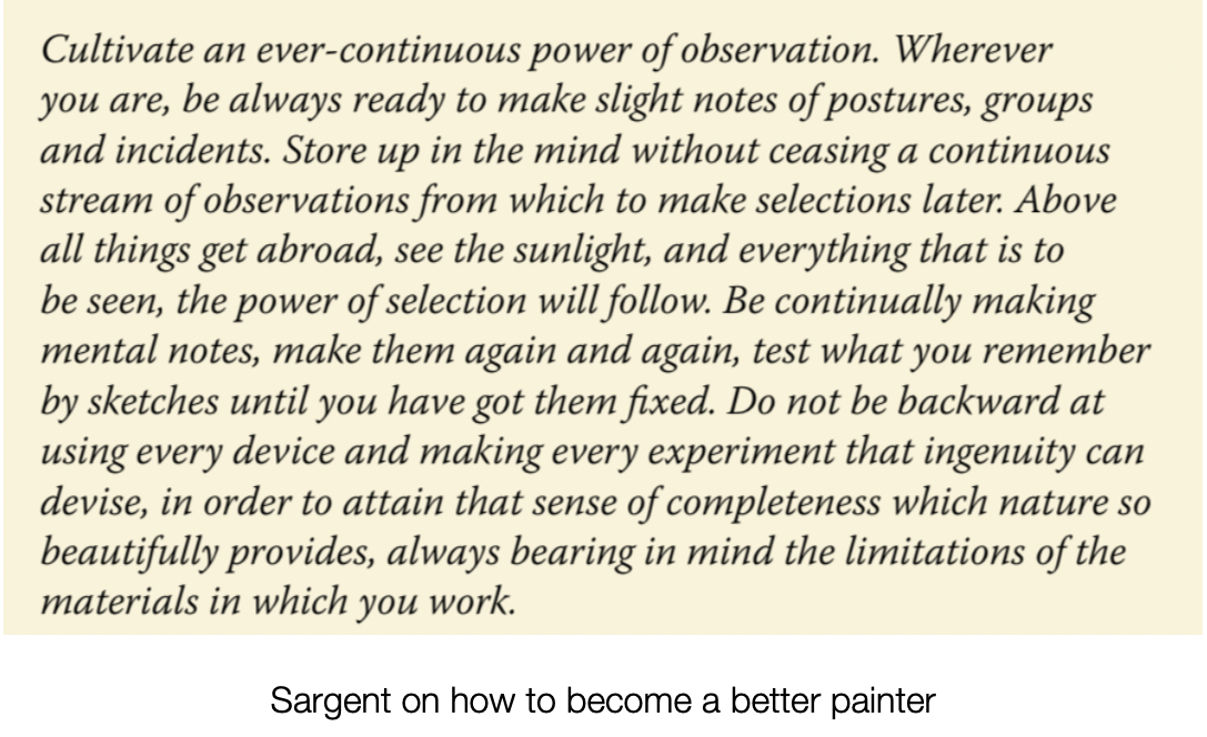 Carolus Durant’s most important advice to Sargent was this: “En art, tout ce qui n’est pas indispensable, est nuisible”. Sargent made this painting of Durand in 1879. This means that everything which is not absolutely necessary to the painting must be discarded. In a good poem, removing even one word destroys the whole thing. In a good story, removing even one detail causes the whole piece to become imbalanced. Similarly, in a masterful painting, every single brushstroke is crucial to the structure of the whole piece. You will see in Sargent’s paintings how faithfully he executed this lesson.