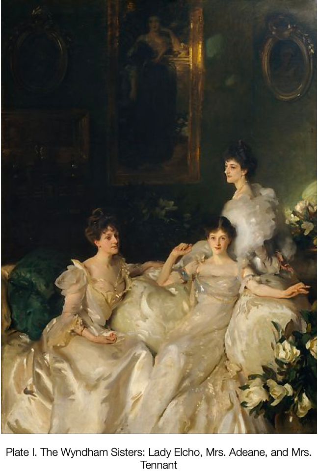 The first story we will discuss is the painting of the Wyndham Sisters. In this painting, there are three very wealthy, aristocratic women reposing on a couch, adorned in glittering golden gowns. The youngest sister looks out from the canvas at the viewer in a confident pose that is mirrored above her, by an obscured portrait of a woman in a golden frame who may be their mother.
