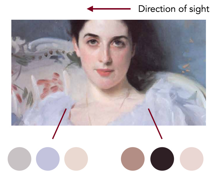 The law of contrasts is the key to understanding Sargent’s technique in this painting as well. When we compare the left side of Lady Agnew’s neck compared to her right, the right side has much more contrast. An artist creates contrast by controlling the tones and values of the colours. The colours on the right side of the neck are painted with greater contrast than the ones on the left. This guides the eye from the left to the right and keeps them on her face. The contrast in her face is also greater than the contrast anywhere else in the painting.
