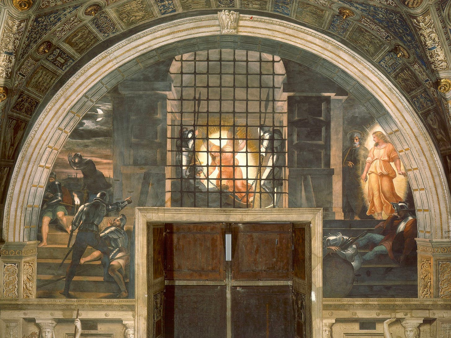 In this fresco, the walls of the prison cell represent not only separations in physical space in the piece but also temporal divisions. The left side of the piece is the beginning of the story, the middle of the piece is also the middle of Saint Peter’s story and the right side is not just to the right of the prison, but also the end of the story. He overalps temporality with spatial divisions to help convey multiple pieces of information at once. He is an innovator. And yet, Raphael does not abandon rules such as perspective, anatomy or colour that were established by the artists before him.