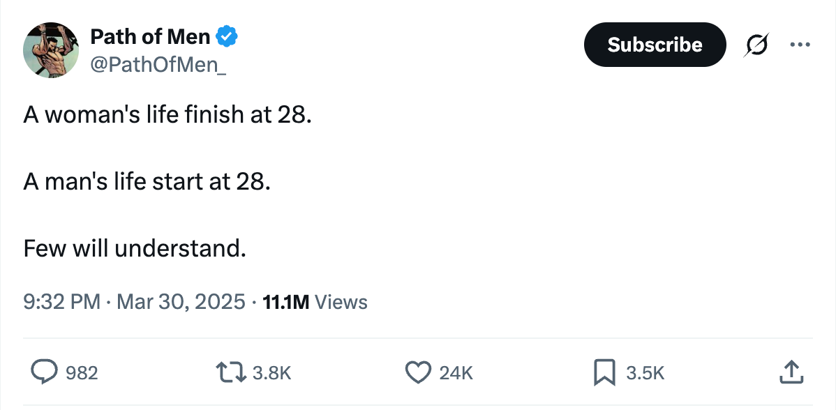 Girls as young as 26 are getting botox and hyper-fixated on sixteen step anti-aging skincare protocols. Men are hyper-focused on optimising their blood work so they don’t age, and as much as they flex in their selfies are incapable of fighting, incapable of bending the world to their WILL to make it how they want it to be. Without the proper telos for our best qualities, they deteriorate and become nothing but cheap, humiliating costumes.
